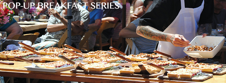 We at the Santa Cruz Community Farmers’ Markets miss no opportunity to celebrate around good food. Since 2012 we have been hosting pop-up breakfast events at the Westside and Scotts Valley markets. At these sweet gatherings guests sit down at long tables with friends and enjoy a fresh, multi-course meal. Each event spotlights an admired local chef giving rise to sensational mixes of simple cuisine made with seasonal ingredients from the very farms that sell at the markets. Local youth leaders, graduates of the food justice organization FoodWhat, serve the fair and farmers speak about their work. Events are unique, each one offering its own pleasing qualities: a cider or wine tasting, local musicians, seasonal pickles, creative flavor pairings, cultural foods, words from a local fisher or flower grower. Guests walk away satisfied and happy, with only a memory of place and time…and a full belly. For more information call 831-325-4294 or email education@santacruzfarmersmarket.org.